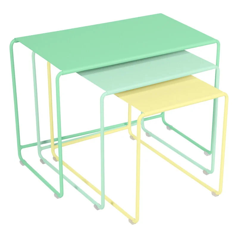 Oulala is both the name of Fermob’s fun nesting table and your reaction when you see it. The Oulala nesting table consists of three elegant metal side tables that nest perfectly inside each other to save space. The light and airy look of the Oulala tables is perfected with fresh colour combinations and their simple yet eye-catching design fits into a wide range of interiors. Create a fun group of tables next to a sofa or scatter them around the garden or terrace – the versatile Oulala tables work wonders both together and individually, indoors and out.