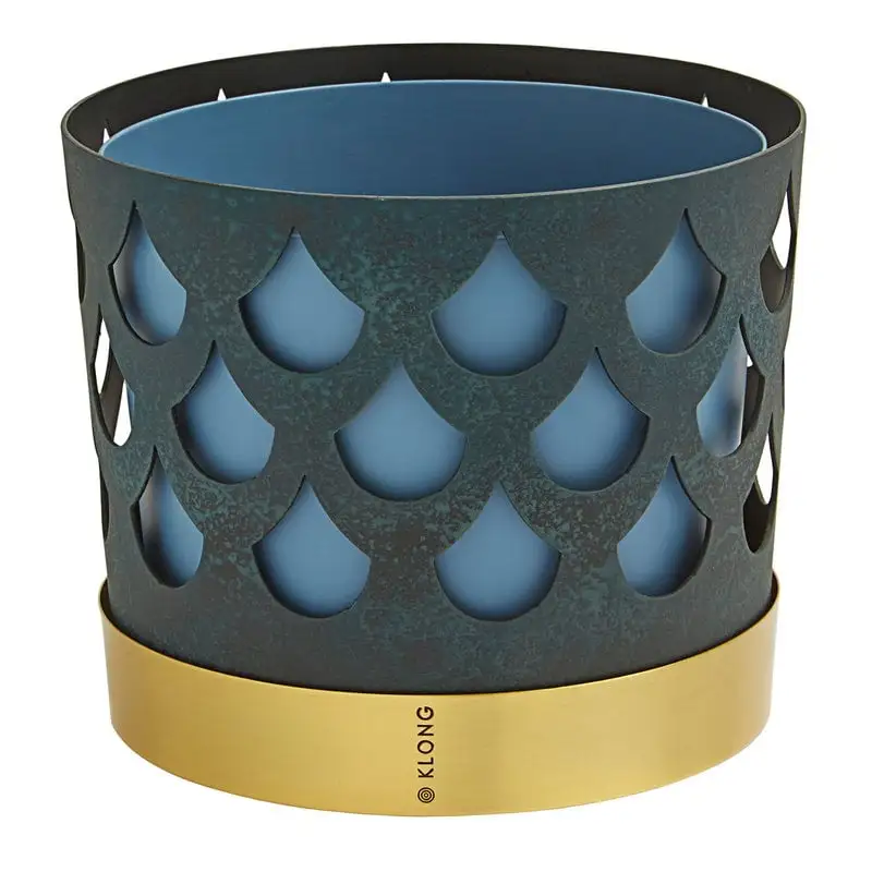 The Trio flower pot by Klong consists of three different elements: a blue inner pot, a steel layer with perforated patterns, and a lacquered brass tray. Designed by Ania Pauser, the Trio pots create an intriguing contrast with green plants, and the different sizes and colours of the collection fit beautifully together.